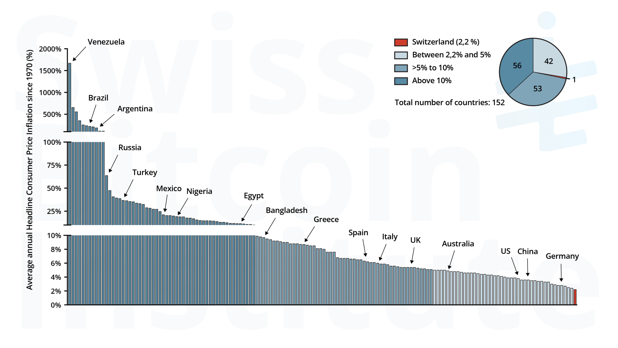 Abbildung 1: Durchschnittliche jährliche Inflation von 152 Ländern seit 1970. Seit dem Ende von Bretton Woods hat kein Land durchschnittlich weniger als 2% Inflation. Die Schweiz mit 2,2% kommt am nächsten. 42 Länder haben zwischen 2,2% und 5% durchschnittlich; 53 mehr als 5% und bis zu 10%; 56 Länder über 10%. Quelle: Weltbank, Eine globale Inflationsdatenbank, 2025 [9].