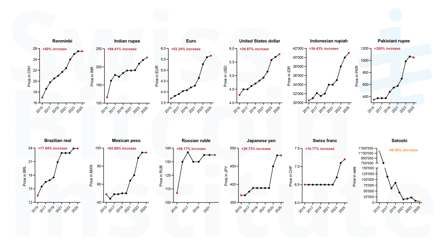 Abbildung 3: Big Mac-Preisentwicklung in Fiat-Währungen und Bitcoin (2015-2025). Jährliche Big Mac-Preise (2015-2025) werden in lokalen Währungen für die zehn größten Währungszonen nach Population dargestellt, die im Economist Big Mac Index repräsentiert sind (Juli-Daten bevorzugt, andernfalls Januar) [20], mit dem Schweizer Franken (CHF) für institutionelle Relevanz hinzugefügt. Das Set umfasst CNY (China), INR (Indien), EUR (Eurozone), USD (Vereinigte Staaten), IDR (Indonesien), PKR (Pakistan), BRL (Brasilien), MXN (Mexiko), RUB (Russland, Daten bis 2021), JPY (Japan). NGN (Nigeria) und BDT (Bangladesch) würden normalerweise nach Population qualifizieren, sind aber nicht im Datensatz. Bitcoin-Preise (1 BTC = 100.000.000 Sats) werden als die Anzahl Satoshis (Sats) gezeigt, die benötigt werden, um einen Big Mac zu kaufen. Um dies zu berechnen, wurde der jährliche durchschnittliche BTC/USD-Preis verwendet, um zu bestimmen, wie viele Sats einem USD entsprechen, und dies wurde mit dem Big Mac USD-Preis multipliziert.